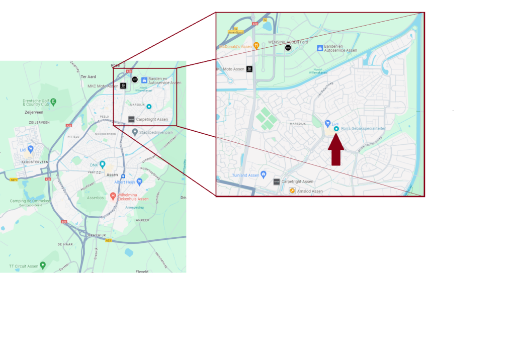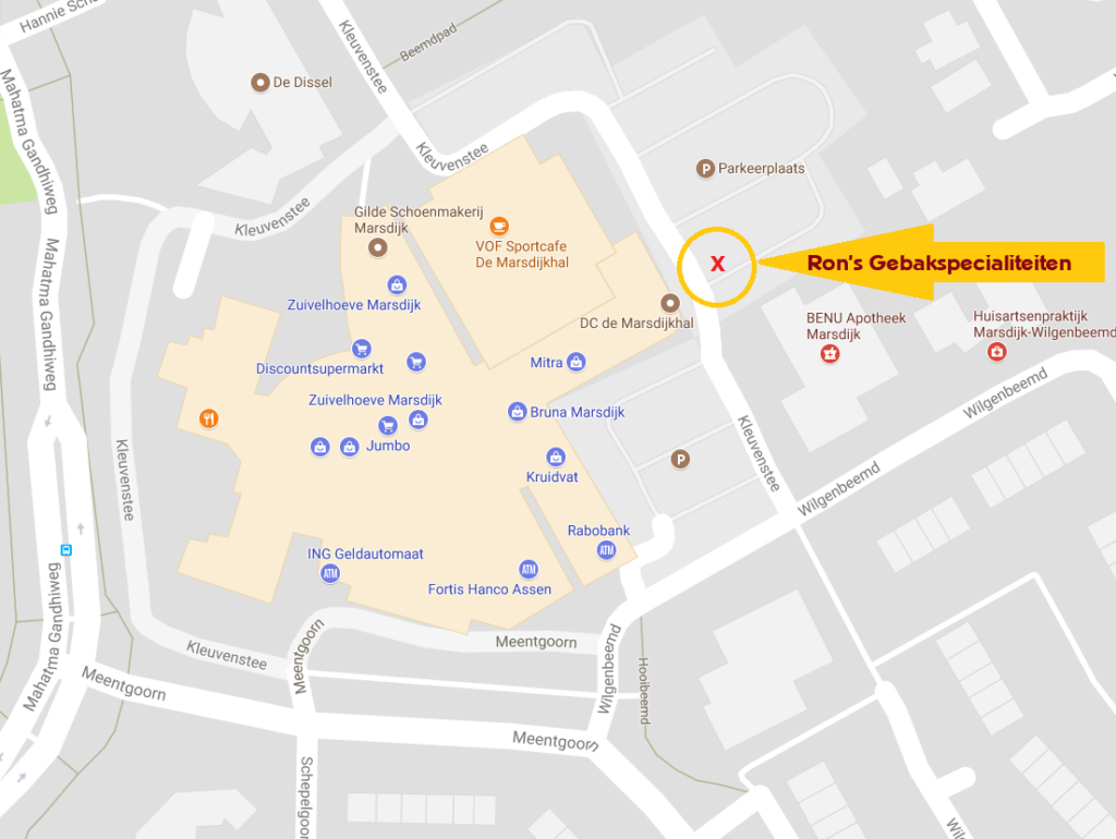 Winterstandplaats Gedurende de maanden oktober, november en december neemt Ron’s Gebakspecialiteiten de winterstandplaats in bij winkelcentrum Marsdijk, op de parkeerplaats aan de Kleuvenstee in Assen.